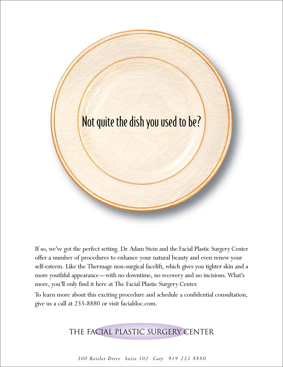 Part of a series of ads for a plastic surgery place in Cary, NC. While I like this headline, working on this creeped me out a bit.