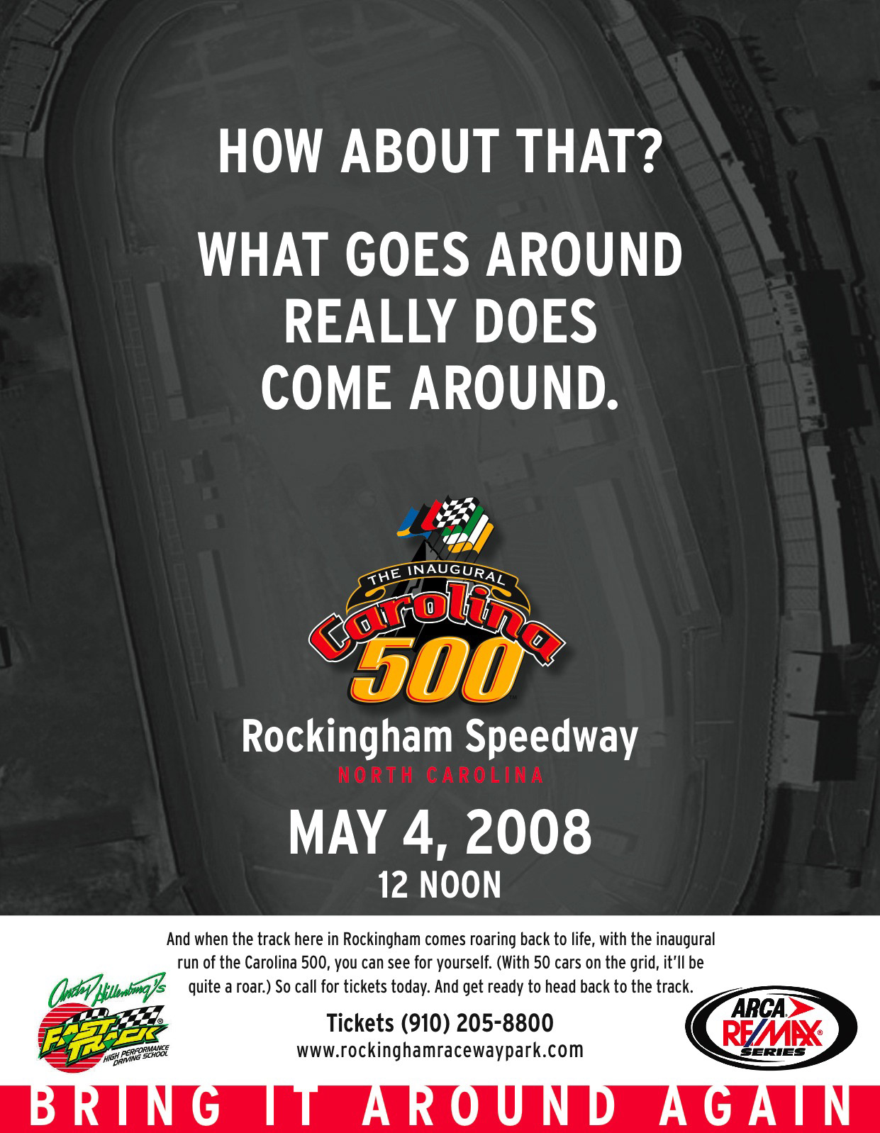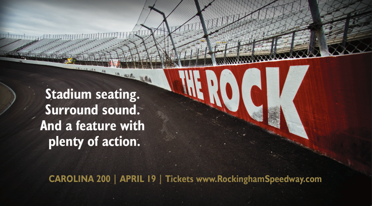 A couple pieces — poster (top) and cinema advertising (bottom) — from an ongoing (and probably underfunded) effort to bring big-time racing back to the Rockingham Speedway.